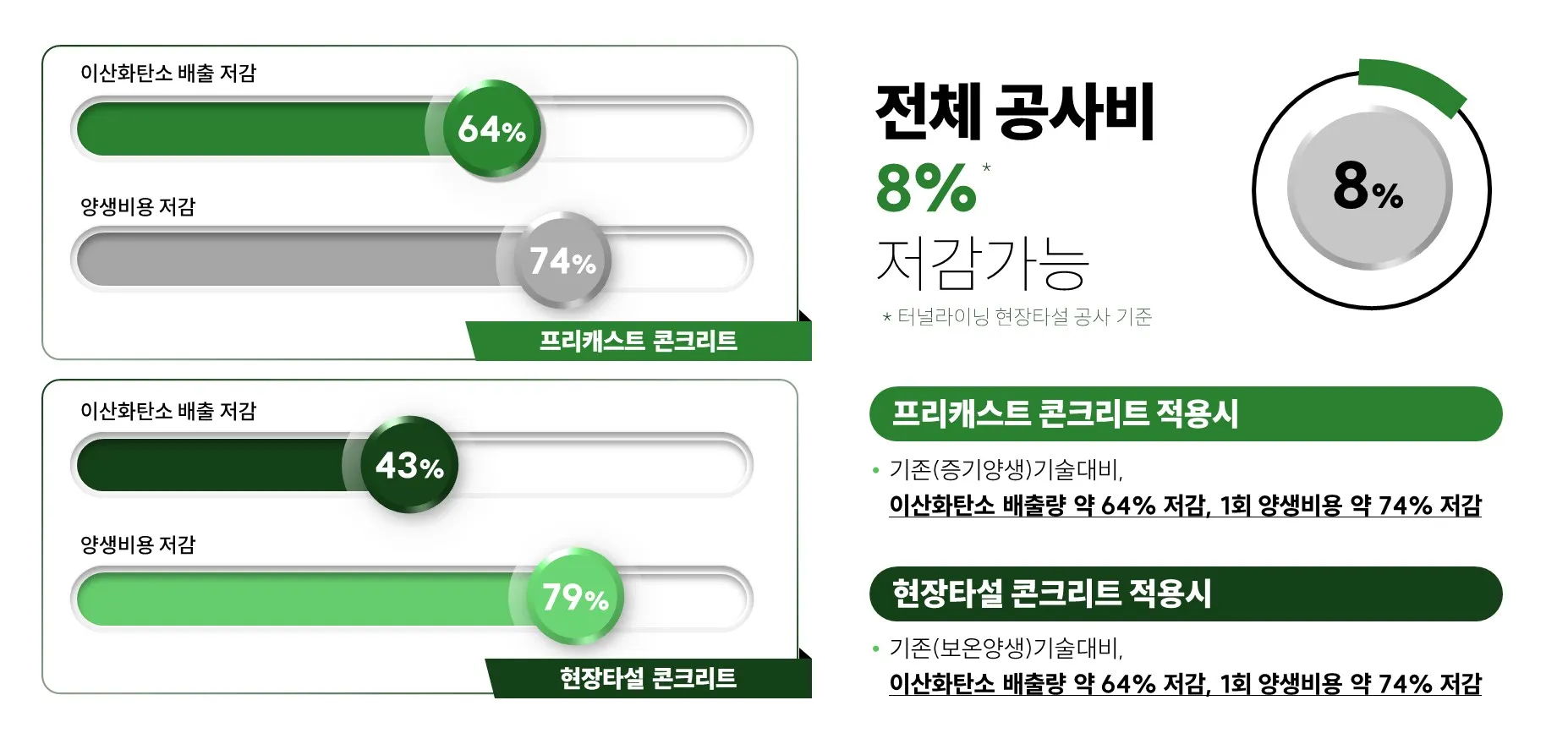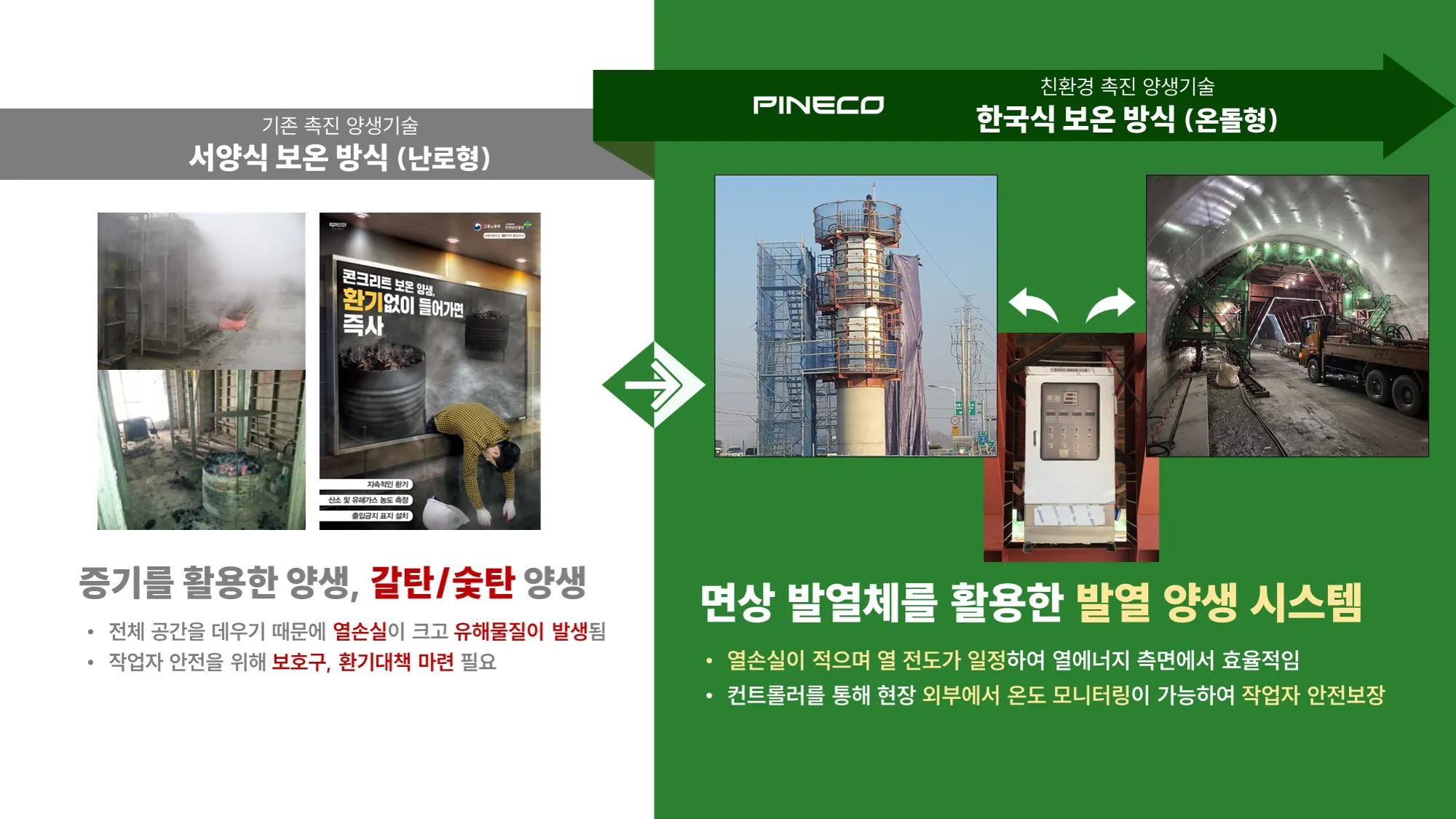 국내외 대부분의 콘크리트 생산은 증기양생(프리캐스트 콘크리트 공장 타설)과 갈탄/숯탄 등 화석연료를 이용한 양생(현장타설)을 통해 이루어집니다. 발열양생 시스템은 화석연료 사용 없이 전기에너지만을 이용해 양생을 촉진하여 미세먼지 및 CO2 발생을 최소화하고, 균일한 발열 및 온도 분포를 통해 고품질의 콘크리트 생산을 가능하게 하는 새로운 양생법입니다. 고객이 최우선적으로 원하는 공기단축을 통한 비용절감을 가능하게 하며 계절과 상관없이 1일 이내 안전하게 콘크리트 양생 완료가 가능한 기술입니다.
