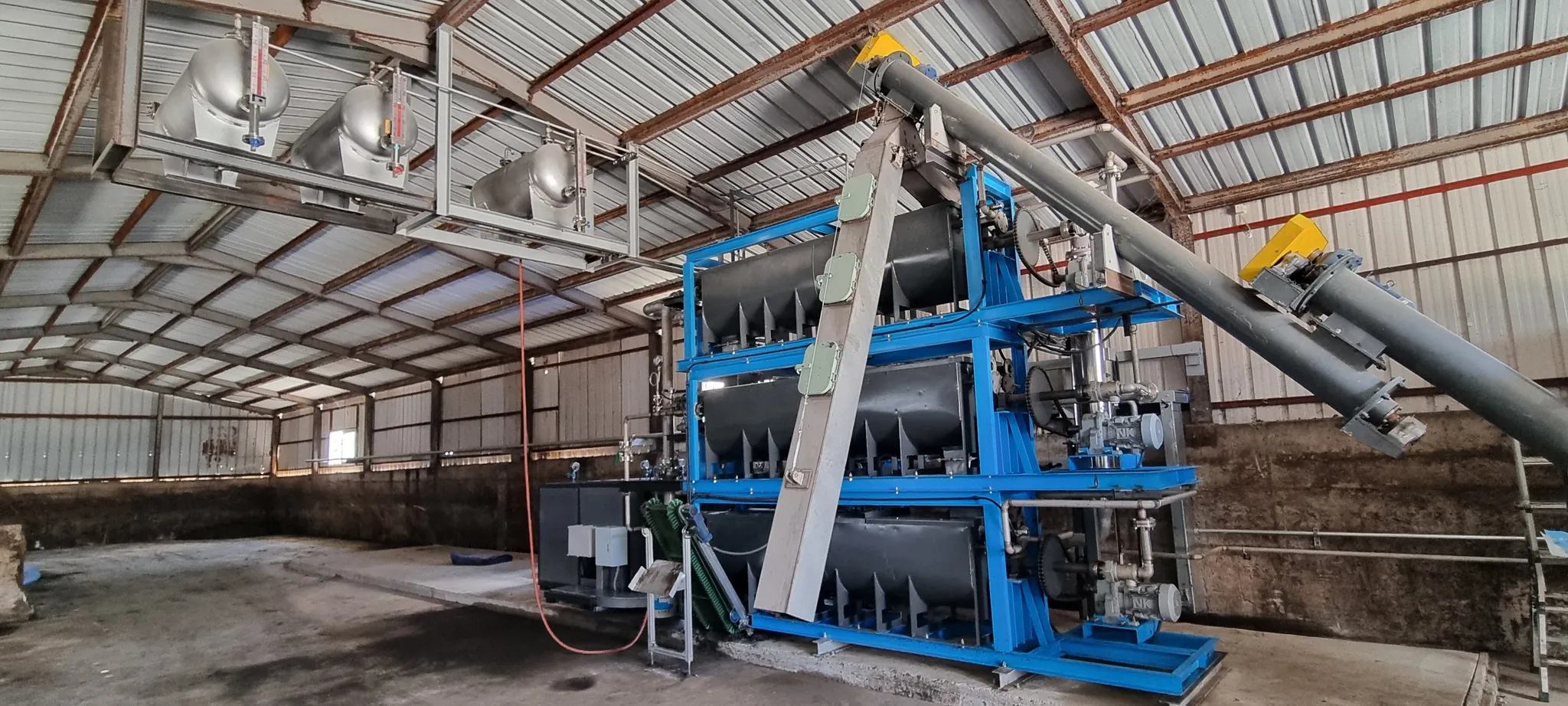 열분해 기술 (한국에너지기술연구원 기술이전): 건조 단계를 거친 건조물(함수율 20%)은 열분해기로 유입되어 375℃~450℃의 고온에서 열분해하여 EBC(유럽바이오차인증) 기준에 적합한 가축분바이오차(함수율 2%) 생산