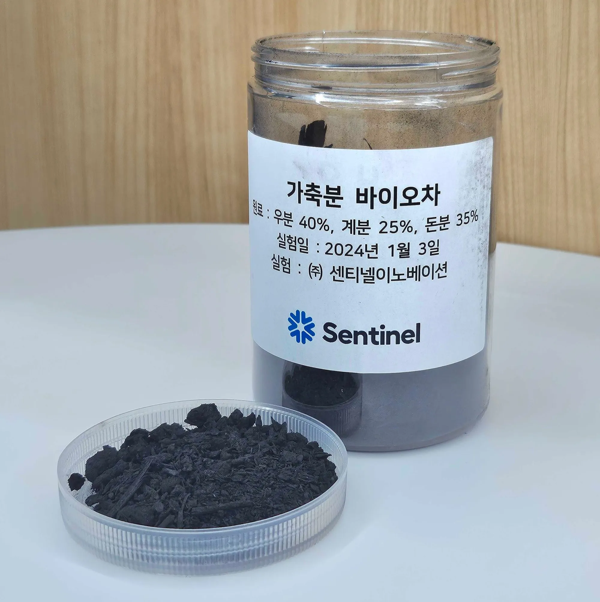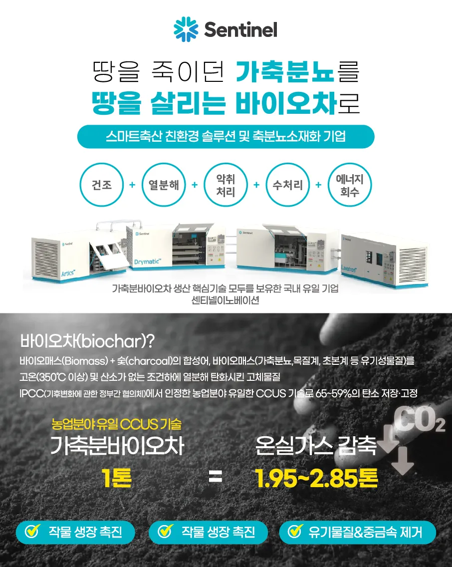 센티넬이 생산한 바이오차는 IPCC가 인정한 CCUS(온실가스 저장 및 포집)기술로, 가축분 바이오차 1톤은 약 2~3톤의 온실가스를 저감할 수 있어 농업분야의 장기적인 기후 임팩트를 가져올 수 있습니다.