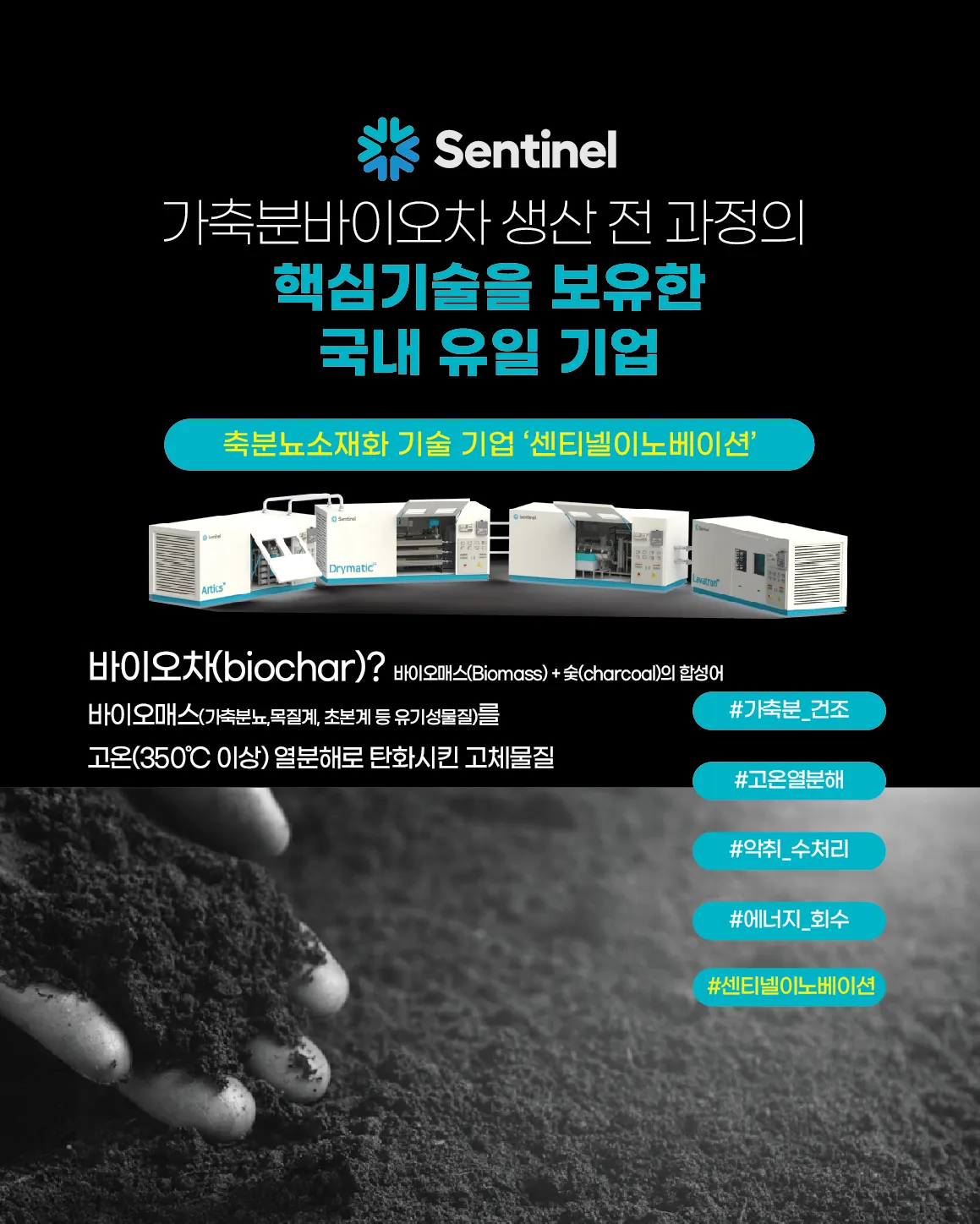 센티넬은 기술 혁신을 통해 물과 공기, 땅의 지속 가능한 순환을 구축하는 기후테크 기업입니다. 실내 환경인 인공기후 분야의 프로젝트 노하우를 기반으로 각종 환경오염을 유발하는 가축분뇨 문제 해결을 위한 ‘가축분뇨소재화’ 솔루션을 제공합니다.