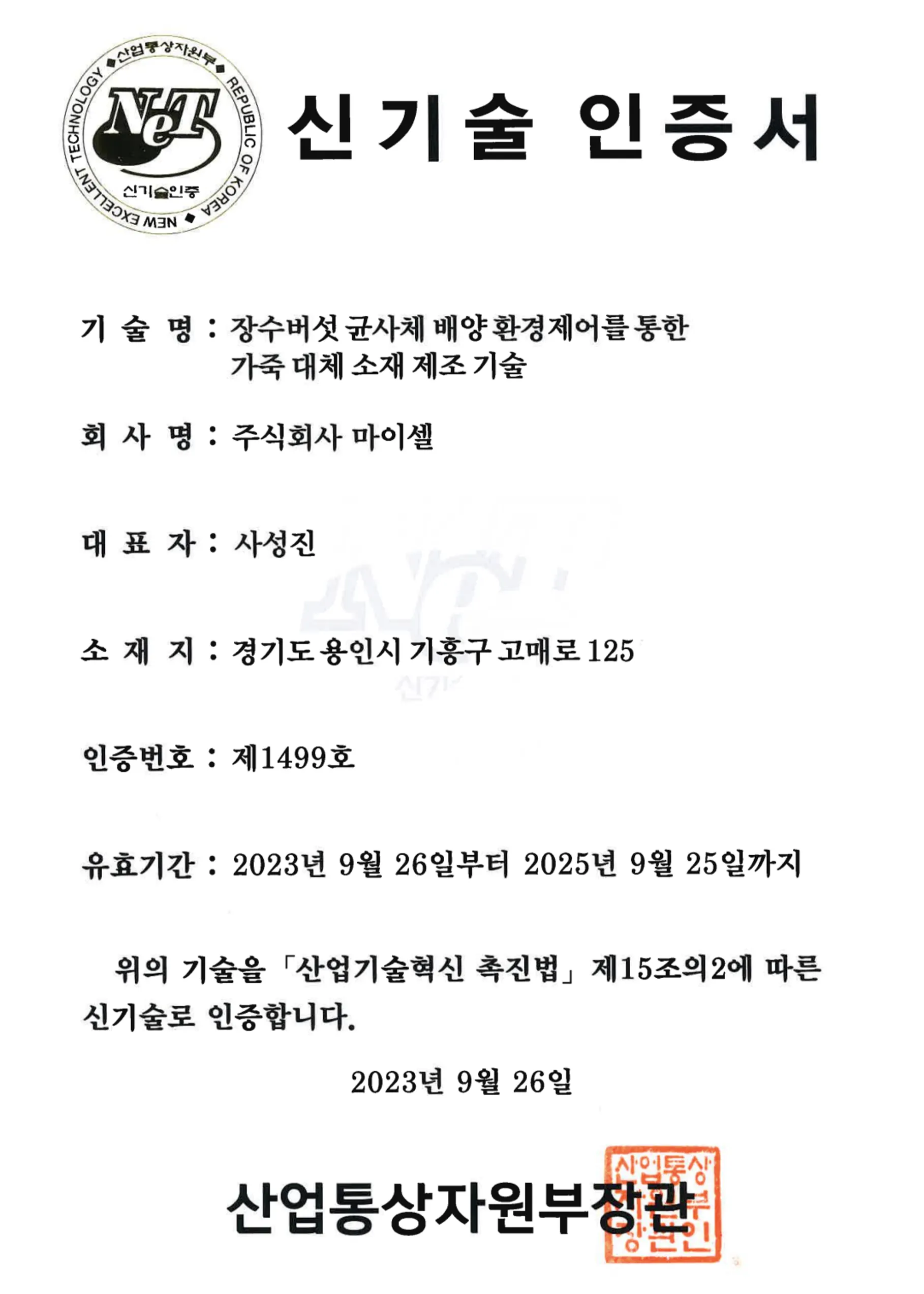 균사체를 배양할 수 있는 영양분인 배지와 균사 가죽 원소재인 종균의 배합 기술을 개발하고, 균사 원피를 배양시 두껍게 형성되고 배양속도를 향상 시킬 수 있도록 C/N비의 최적화를 연구하여 배지설계 기술과 환경변수 조절 기술을 확보했습니다. 또한 이를 대량생산할 수 있도록 소재화 기술을 개발하여 인장강도, 인열강도 등의 물성이 향상되고 방오성, 내스크레치성 등이 부여되었습니다.