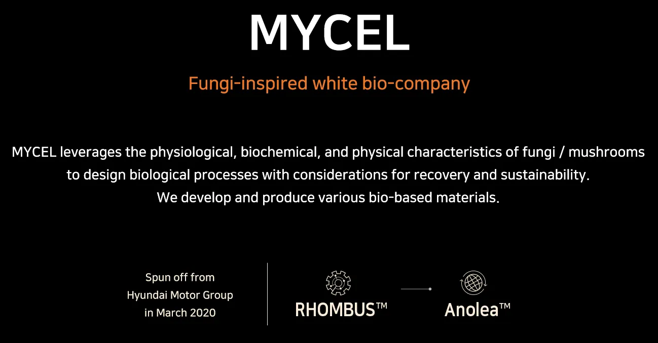 마이셀은 현대자동차로부터 분사하여 버섯/곰팡이 균사체를 이용한 식품 및 패션 등 여러 산업에서 사용될 수 있는 소재를 만드는 “화이트 바이오” 스타트업이고, 이를 “생체모방”을 기초로 생산시설이 생물학적 시스템을 모사할 수 있도록 생산공정을 디자인하고 이를 바탕으로 가죽 대체 소재 및 다양한 생화학적 소재를 제조하고 있습니다.