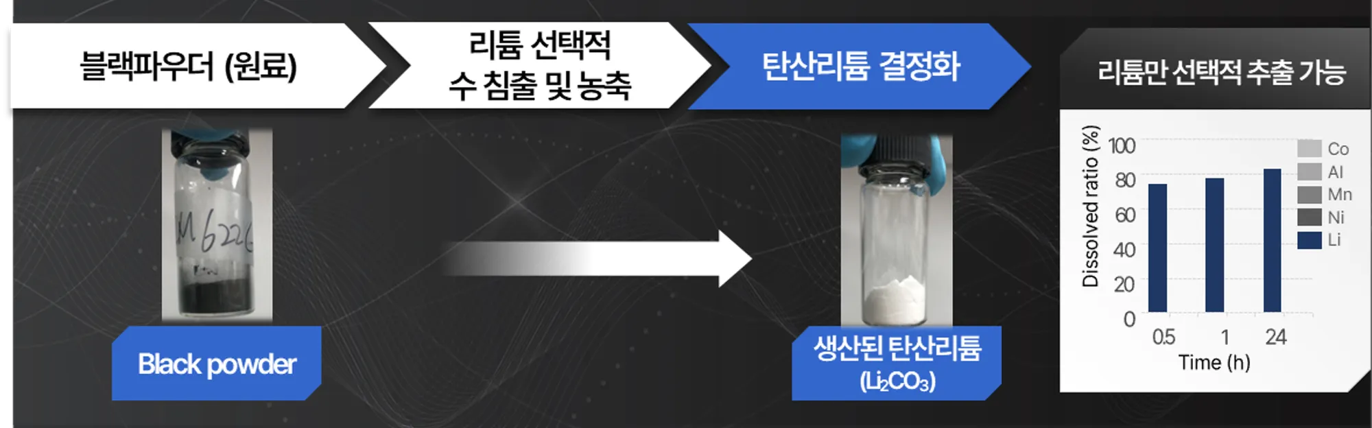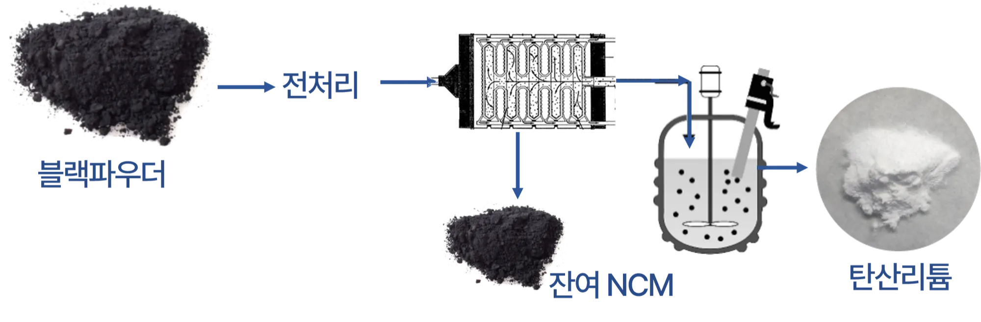 폐배터리에서 발생되는 블랙파우더에서 열처리 없이 리튬만 선택적으로 추출 및 탄산리튬으로 회수하는 기술을 가지고 있으며, 블랙파우더를 털어낸 뒤에 나오는 금속폐자원에서 양극재 원료자원들을 재회수 하는 기술을 확보하고 있습니다. |또한 철강시스템에서 발생하는 망간분진 폐기물에서 망간을 추출하고 황산망간으로 회수하는 기술을 가지고 있습니다.