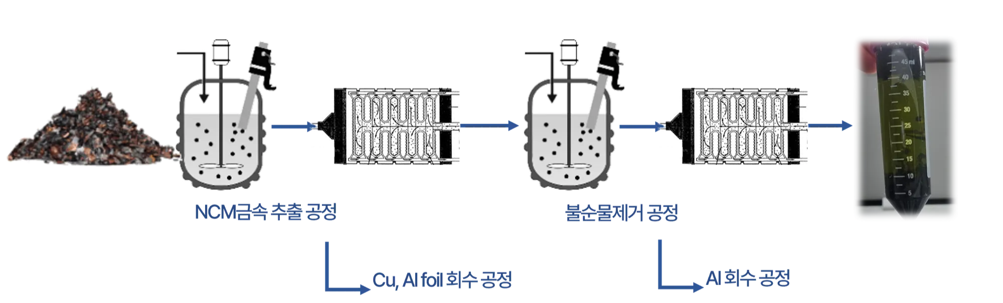 자사의 기술은 금속회수를 하는데 있어서 화합물 사용을 최소화하였고, 기존의 건식/ 습식 금속 추출 공정과 비슷하거나 더욱 높은 추출율을 확보하였습니다. 공정간 발생하는 환경유해물질들을 최소화시켰으며, 폐자원에서 모든 물질들을 회수할 수 있는 공정시스템을 구축하고자 합니다.