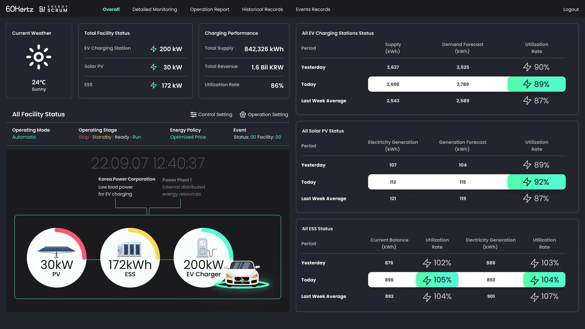 에너지스크럼(EnergyScrum)은 태양광, 에너지저장장치(ESS), 전기차 충전기 등 다양한 분산전원을 하나로 통합해 관리해주는 시스템입니다. AI 기술을 사용해 에너지 공급과 수요를 정확히 예측하며 다양한 관리 기능을 제공합니다. 에너지스크럼은 분산 전원 각각에 대해 원하는 용도와 목표에 따라 맞춤 설정을 적용해 친환경 전기 사용을 극대화할 수 있습니다. 에너지스크럼은 태양광 발전소의 발전량과 전기차 충전 수요량을 예측해 수급 통합 관리를 도와줍니다.