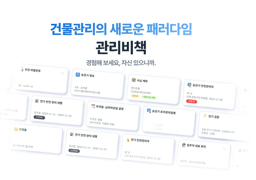 ‘관리비책’ 솔루션은 아파트가 아닌 건물에서도 관리비 및 관리 운영이 쉽고 효율적으로 가능하게 하는 솔루션입니다.