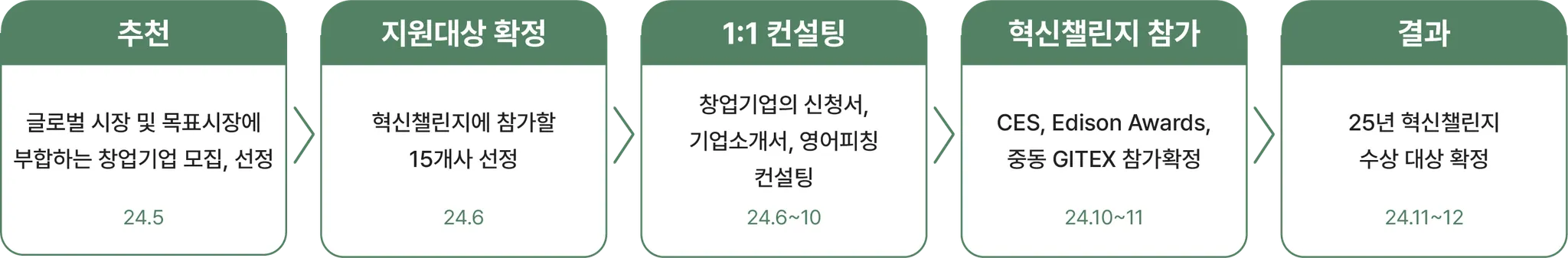 지원목표 | CES 및 Edison Awards, GITEX IMPACT 에서 수상할 수 있도록 창업기업의 컨설팅 지원, 목표시장 내 비스니스 확장을 위한 기술 및 서비스 주목도 향상
