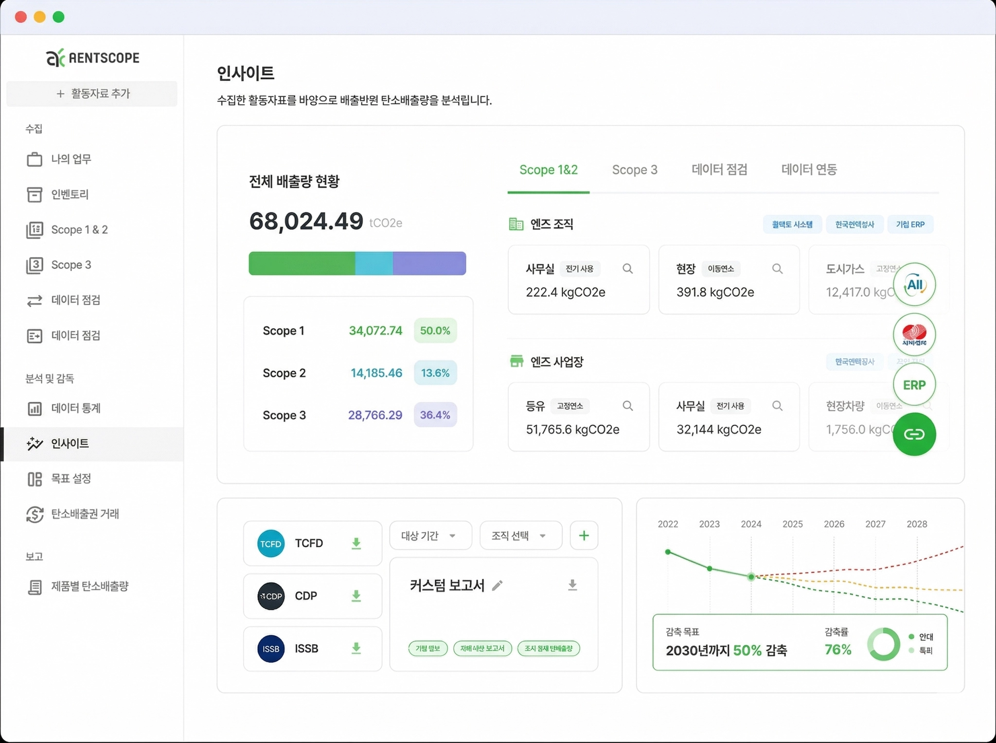 또한 ISSB IFRS S2, KSSB 등 국내외 기후공시 기준에 맞는 리포트를 자동으로 생성해 기업의 공시 준비 부담을 낮춥니다.
