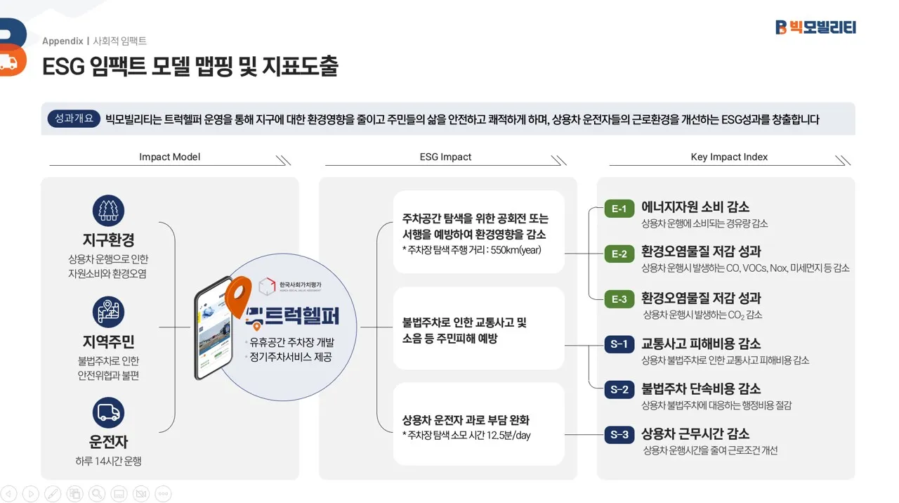 빅모빌리티는 도시의 유휴부지를 재생하여 상용차 전용 주차장으로 개발하여 주차 검색을 위한 공회전 (하루평균 15-20분)을 줄이고, 밤샘불법주차로 인해 발생하는 교통사고를 예방하며, 초급속 충전 인프라를 통해 기존 경유 중심 상용차 연료를 친환경화 하고 있습니다.