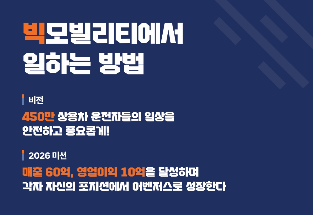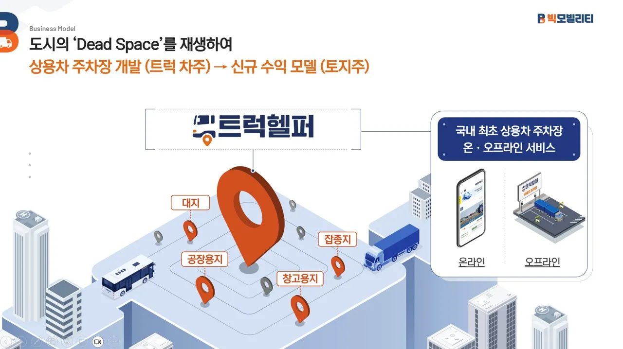 주식회사 빅모빌리티는 ‘트럭헬퍼’ 서비스를 통해 도시의 유휴부지를 재생하여, 터무니없이 부족한 대형 상용차 주차장 및 충전 인프라를 보급하여 450만 상용차주들의 일상을 안전하고 풍요롭게 만듭니다.
