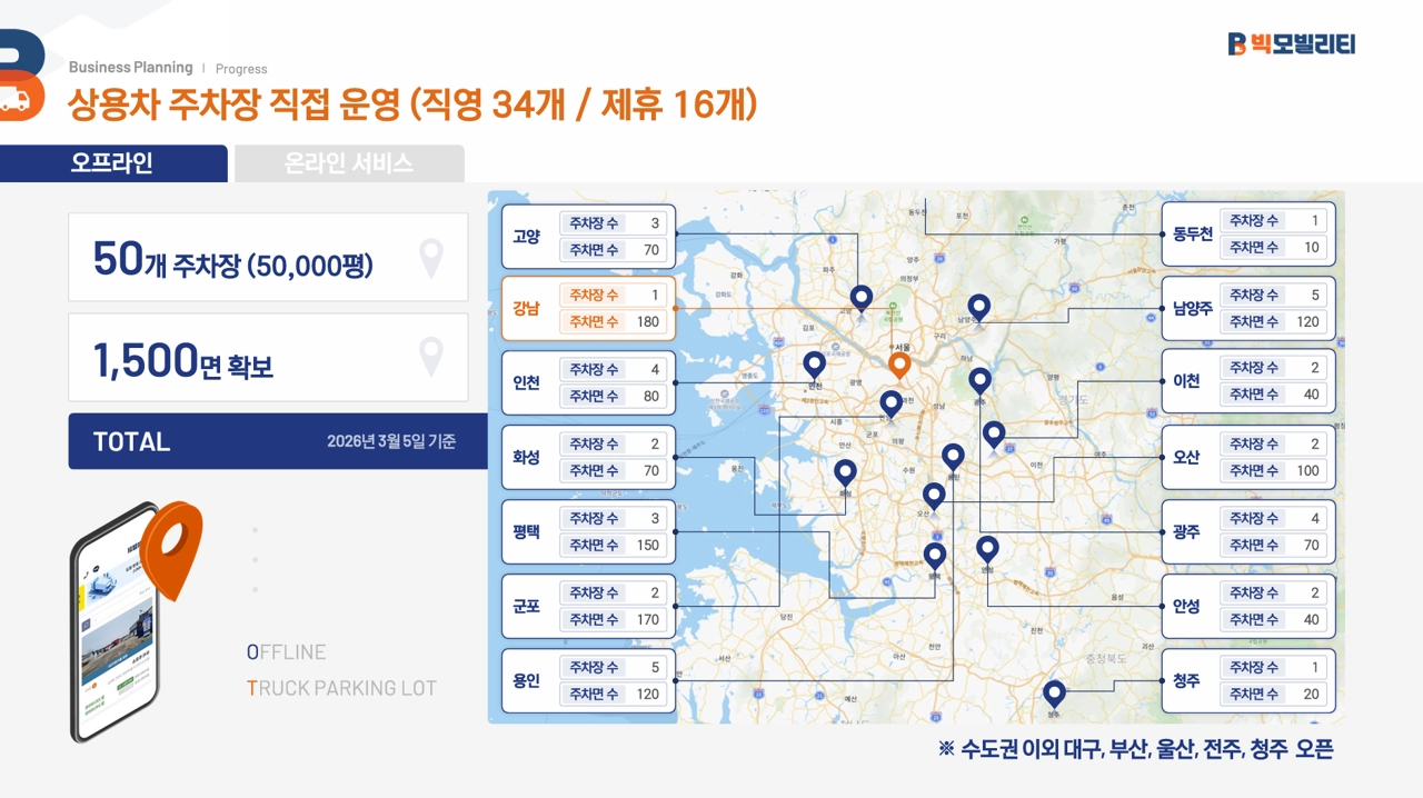 오프라인 주차장뿐만 아니라 상용차주차장 온라인 검색 서비스 ‘트럭헬퍼’를 동시에 운영하고 있습니다.