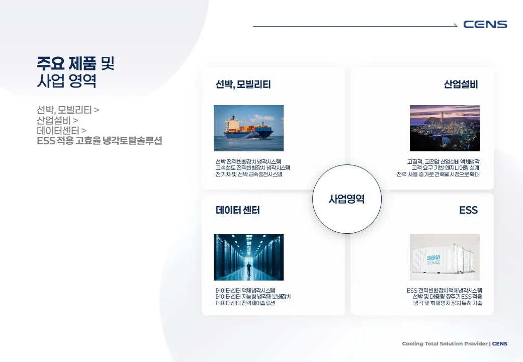 CENS는 Cooling Engineering & Solution 기업으로서, 산업 현장의 안정성과 에너지 효율을 동시에 설계하는 차세대 냉각 인프라 전문 기업입니다.