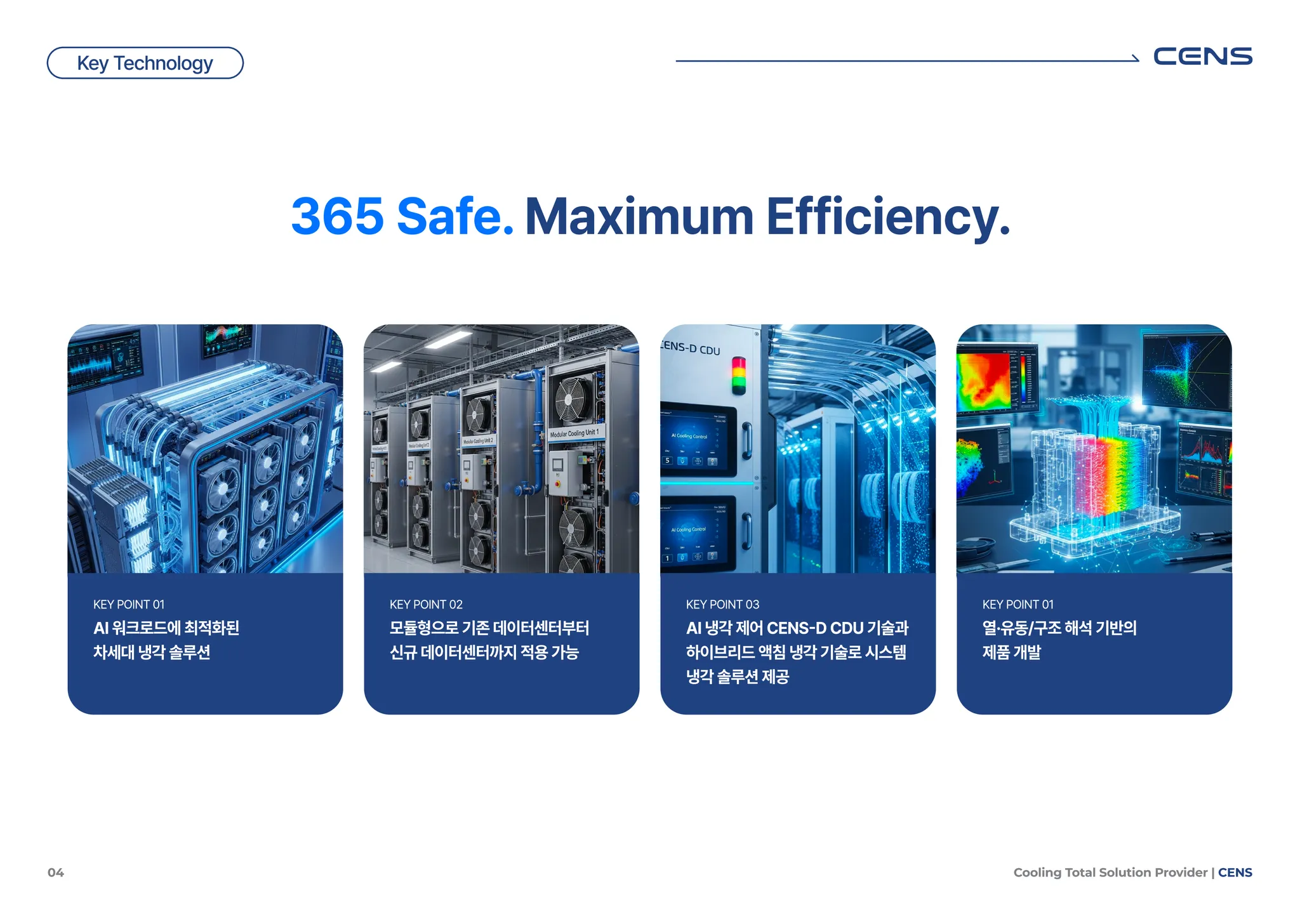 CENS는 고효율 액체 냉각 기술을 기반으로, 설비의 과열과 정지를 방지하고, 에너지 손실을 최소화합니다.