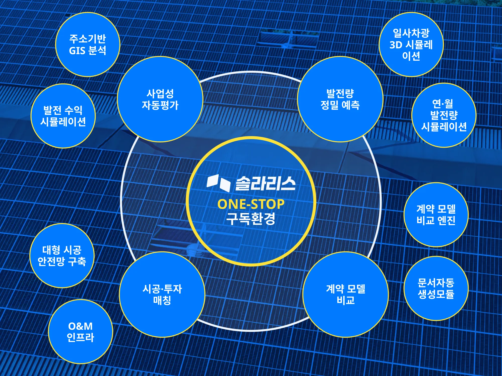 이를 통해 지붕형 태양광의 사업성 평가를 자동화·표준화하고, 최적의 계약 구조 추천부터 시공·운영 연계 관리까지 전 과정을 데이터 기반으로 통합하여, 고객이 가장 쉽고 빠르게 태양광을 도입할 수 있는 원스톱 구독 환경을 제공합니다.