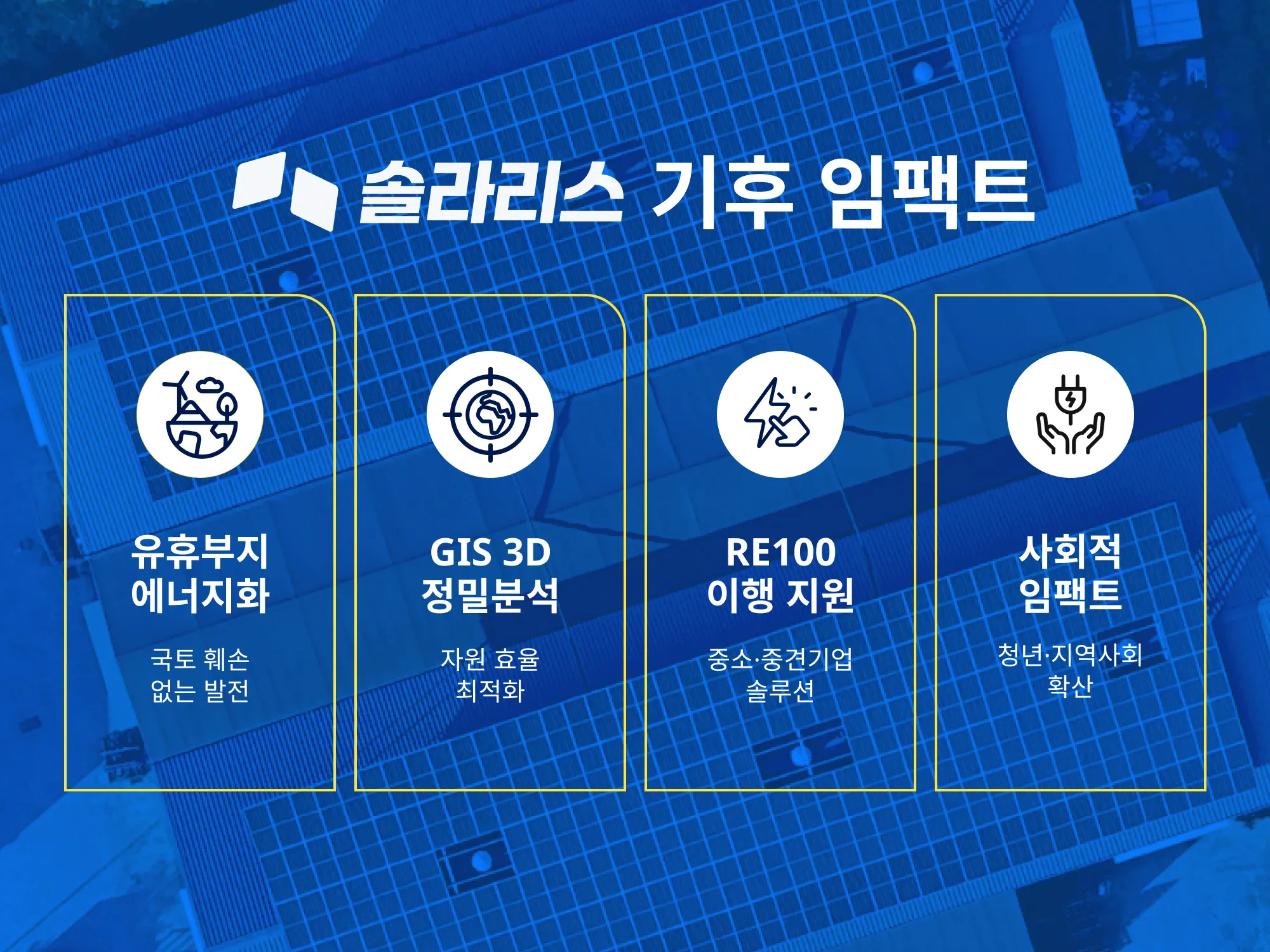 솔라리스는 건물 지붕과 옥상 등 유휴부지를 에너지 자산으로 전환해 국토 훼손 없이 친환경 재생에너지 생산 기반을 구축하고, GIS 3D 시뮬레이션 기술을 활용한 정밀 분석으로 자원 효율을 최적화 및 탄소 감축 효율을 극대화합니다.