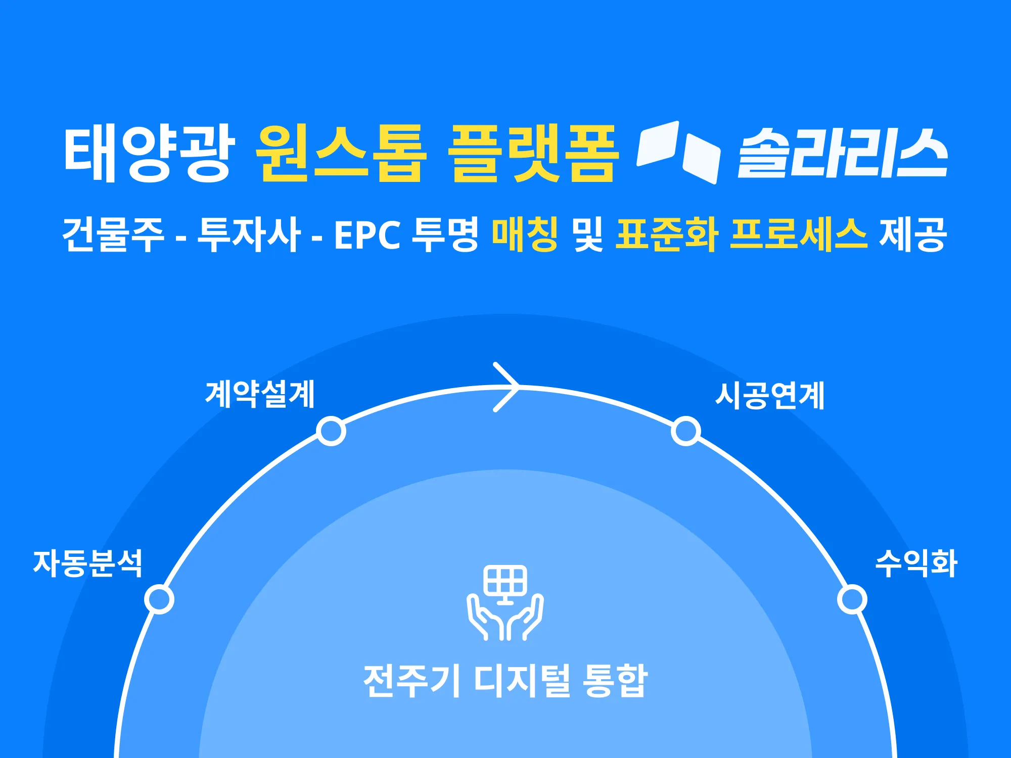 또한 건물주, 투자자, 기업, 시공사(EPC)를 투명하게 연결함으로써 태양광 개발의 비효율과 정보 비대칭을 줄여, 신뢰 기반의 재생에너지 시장 표준을 만들어갑니다.