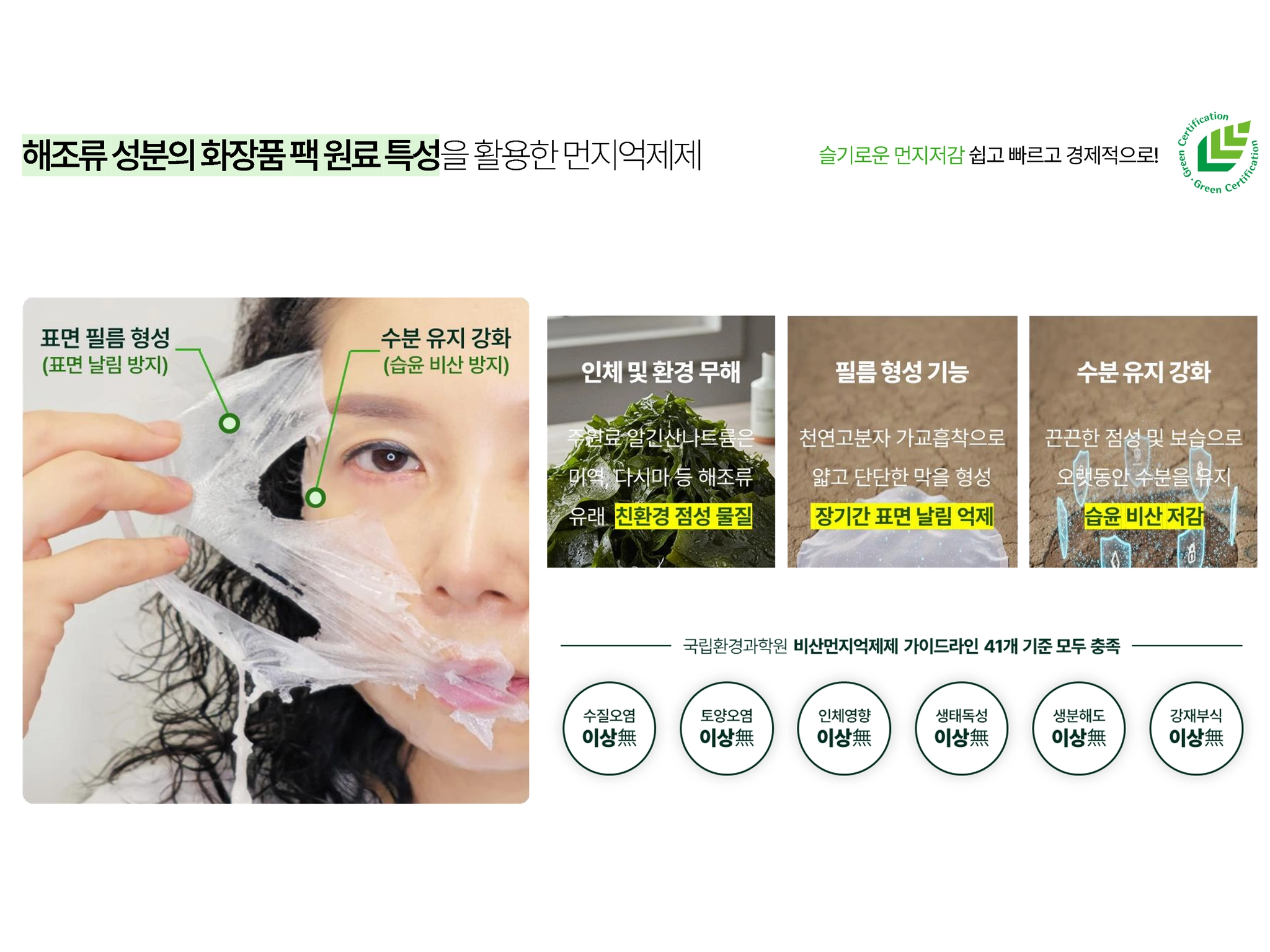 천연 유래 화장품 원료를 사용하고, 국립환경과학원 가이드라인에 따른 41개 공인기관 시험을 통해 인체 및 환경 안전성을 확보했습니다.