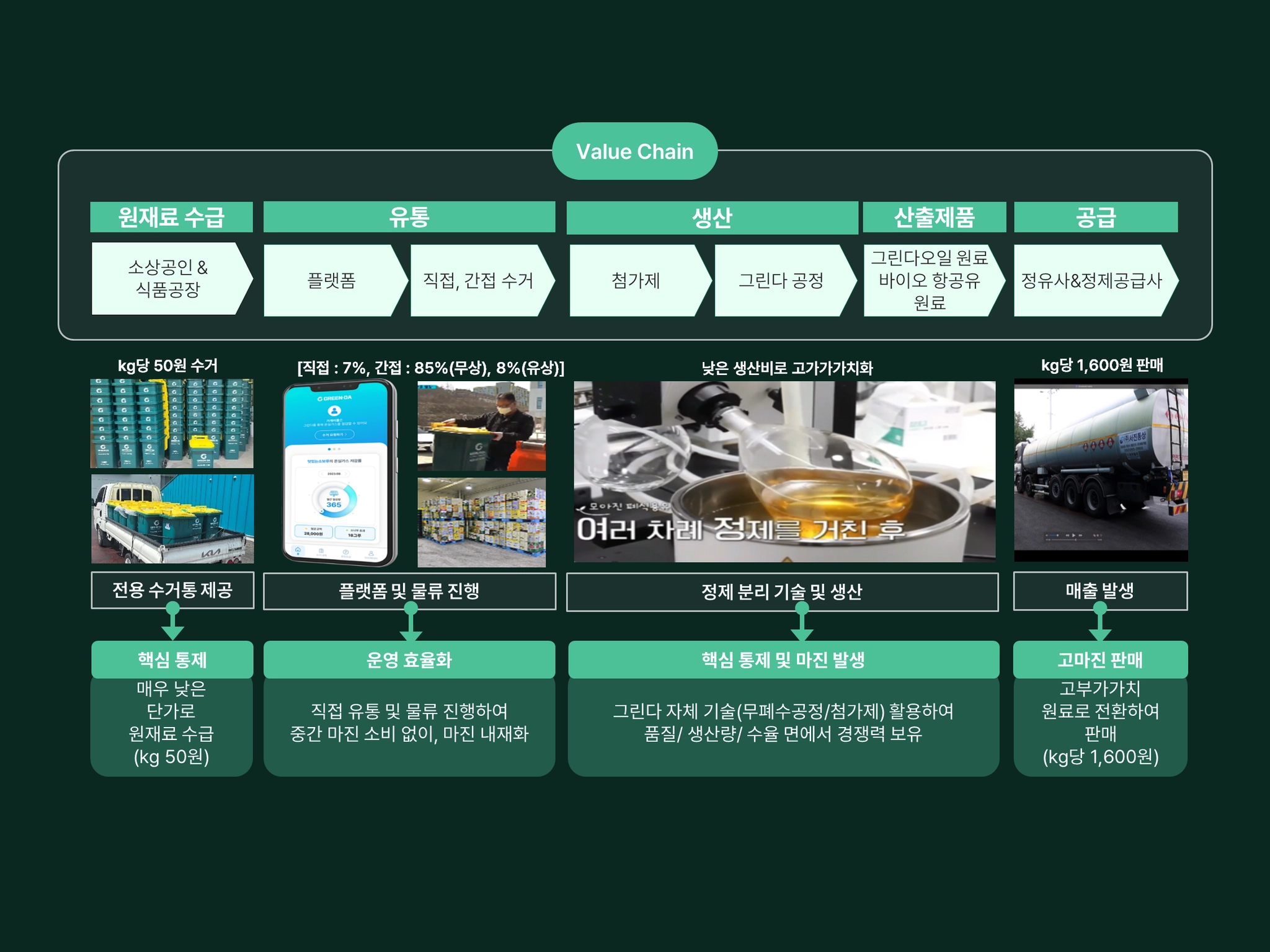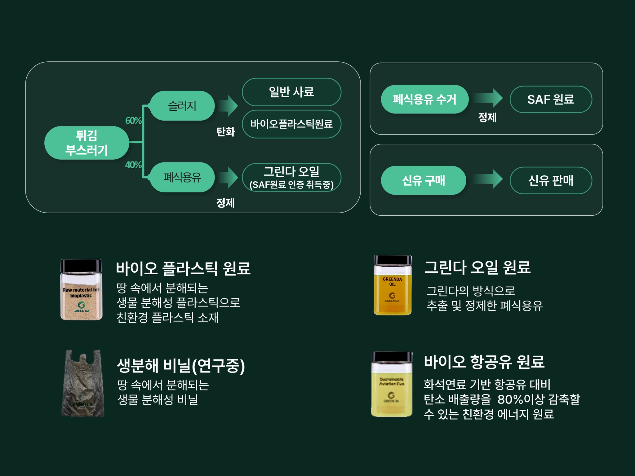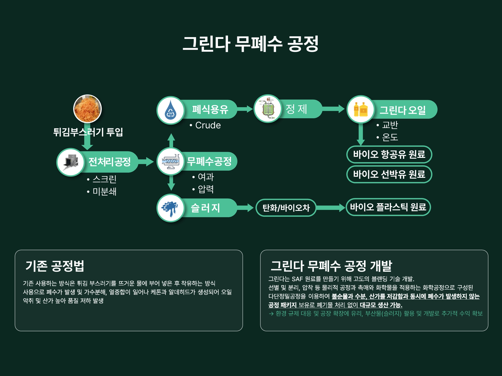 미활용 유지(음식물 폐기물 튀김부스러기)에서 잔존유를 회수하고 전처리 및 정제를 통해 정유사의 Co-processing 공정에 직접 투입 가능한 SAF 원료를 생산·공급하는 사업입니다.