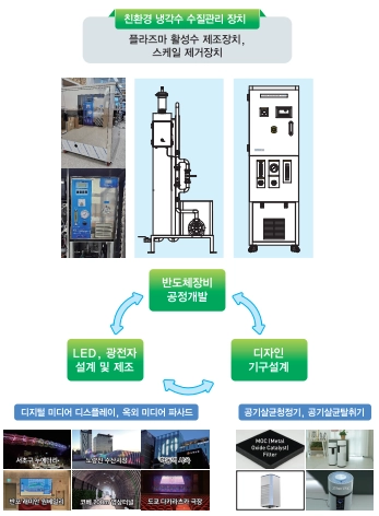 건물 냉방이나 장비의 냉각에 사용하는 냉각수의 수질을 정화하는 장치. 일체의 화학 약품을 사용하지 않고 전기와 공기를 원료로 사용하므로 폐수가 발생하지 않고 물과 전기를 절약할 수 있으므로 운전 비용을 대폭 절감할 수 있음. 세계 최초로 i) 전기분해 기술을 이용한 자동 스케일 제거 기능과 ii) 플라즈마 활성수 제조 기술을 이용한 살균 및 바이오필름 제거 기능, iii) 다양한 수질 측정 센서를 실시간 모니터링하여 자동 제어하는 기능단일 장치에서 동시에 제공