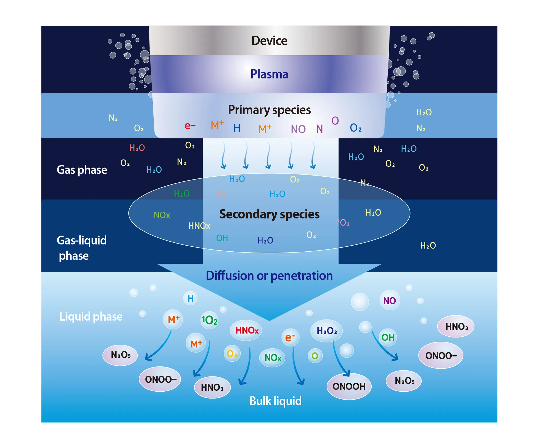 대기 플라즈마 방전 기술을 이용한 다양한 이온 및 활성종 가스 생성 기술 및 생성된 가스를 물에 용해시키는 기술