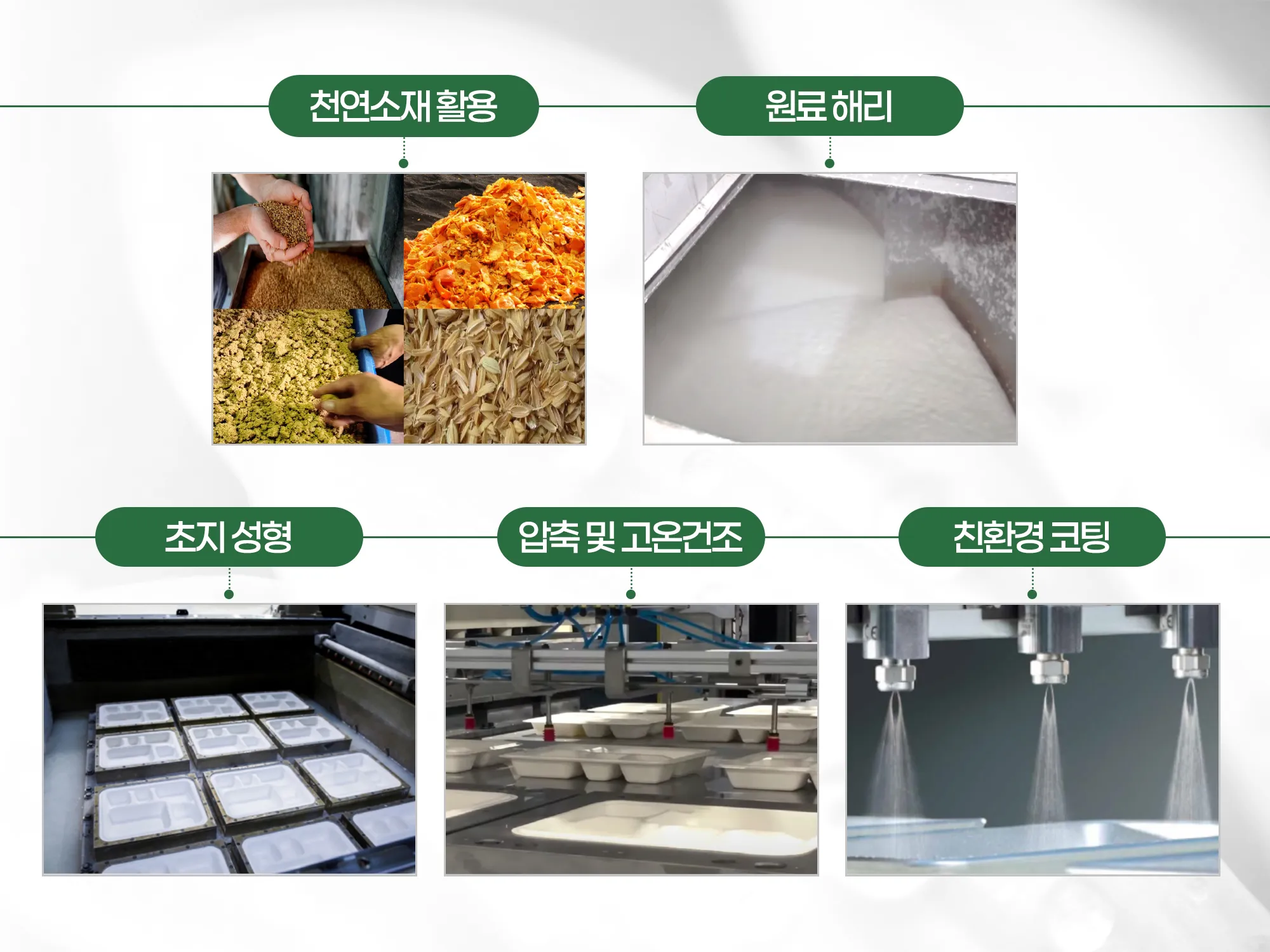 자체 개발한 생분해성 아크릴계 수용성 코팅제와 6축 다관절 로봇 기반 3차원 정밀 스프레이 코팅 공정을 결합하여, 기존 펄프몰드의 수분·유분 취약성을 극복했습니다.