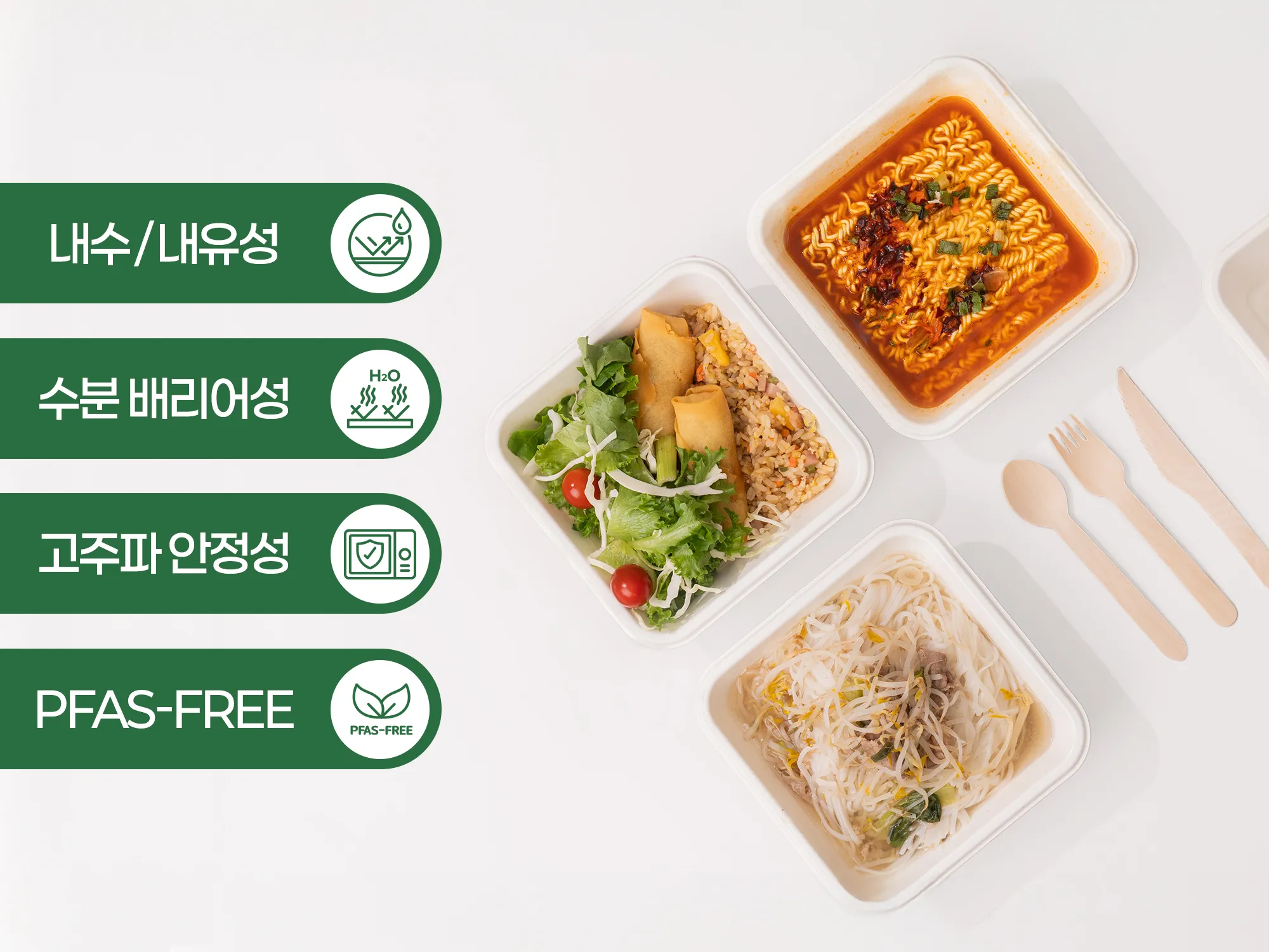 이를 통해 내수성·내유성·수분 배리어성을 구현하고, 고주파(전자레인지) 안전성까지 확보했습니다. 배달·신선식품뿐 아니라 화장품, 전자제품 패키징 등 다양한 산업군 적용이 가능합니다.