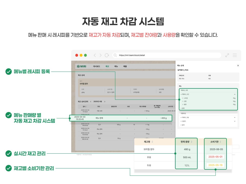 미리는 메뉴 판매 데이터를 레시피와 연결해 실제 식자재 사용량을 자동 계산하고, 판매 즉시 재고에 반영하는 레시피 기반 재고 차감 기술을 보유하고 있습니다.