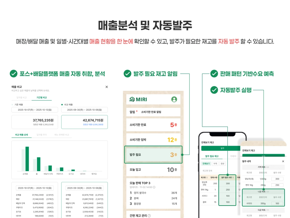 미리(MIRI)는 단순 매출 집계나 수기 재고 관리에 머무르는 기존 POS, ERP, 유통몰과 달리, 실제 식자재 소비 데이터를 기반으로 운영 의사결정을 지원하는 솔루션입니다.